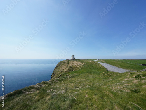 A narrow road leads to a lone tower standing at the edge of a grassy cliff above the tranquil sea