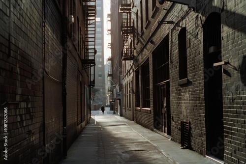 A narrow, shadowy urban alleyway glows with the soft light of dawn, hinting at a solitary figure in the distance.