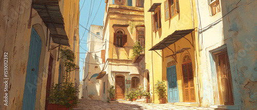A narrow street view with buildings in shades of yellow and white with blue doors and window shutters