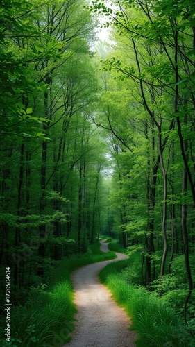 A narrow, winding path through a dense green forest, foggy atmosphere, green labyrinth passage, eerie sounds