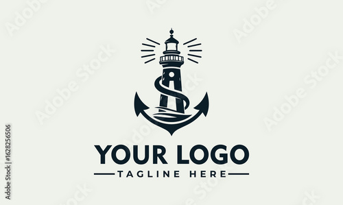 A nautical logo featuring a lighthouse, anchor, and waves, with text below.
