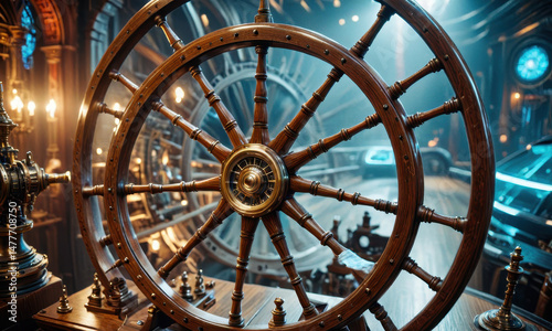 A nautical-themed image featuring a ship's steering wheel with a clock in the background, perfect for use in maritime or navigation-related contexts