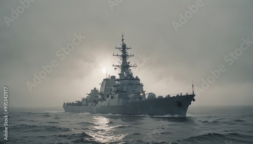 A naval destroyer navigating through a thick fog, with only the ship’s lights cutting through the gloom, while the sea swells ominously around it.