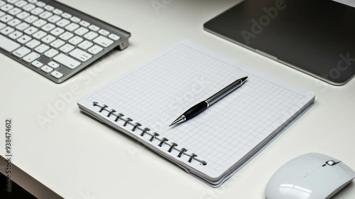 A neat desk with a closed laptop, a wireless keyboard, and a blank notebook with a pen waiting for notes or ideas in a contemporary office setting