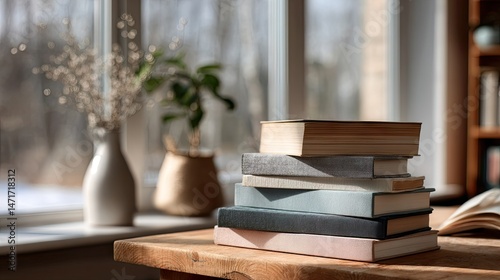 A neat set of hardcover books stacked on a wooden library table, soft daylight streaming through large windows