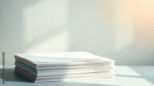 A neat stack of blank paper sits on a surface bathed in sunlight