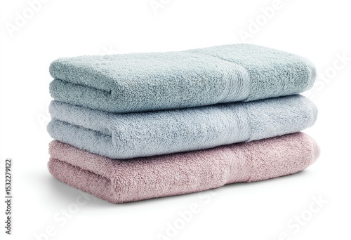 A neat stack of three folded bath towels in pastel blue, light blue, and pink, displayed on a white background