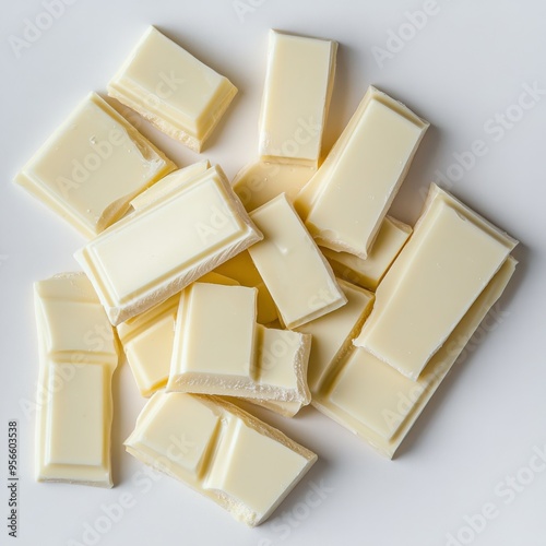 A neatly arranged pile of white chocolate bars placed atop a clean, white surface, creating a visually appealing confectionery display