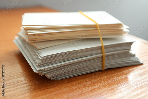 A Neatly Arranged Stack of Blank Cards Securely Tied with a Rubber Band on a Wooden Table