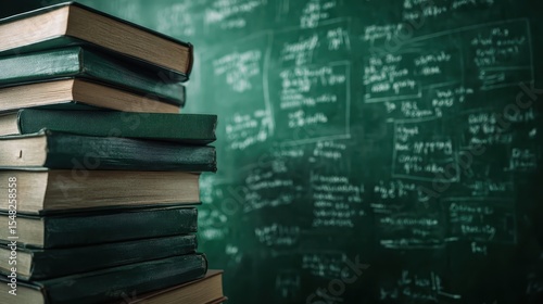 A neatly arranged stack of books in front of a chalkboard filled with mathematical equations, symbolizing education and the pursuit of knowledge in a classroom setting.