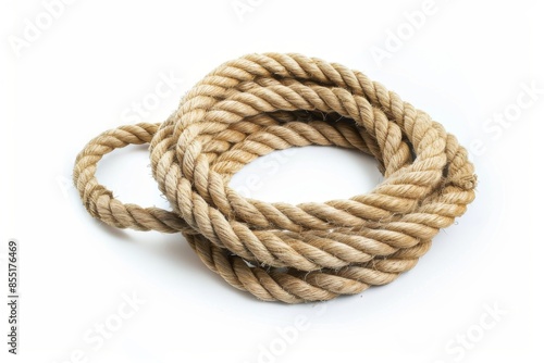 A neatly coiled rope, expertly tied and ready for use, set against a clean white background. The rope's texture and intricate knots are showcased in high detail.
