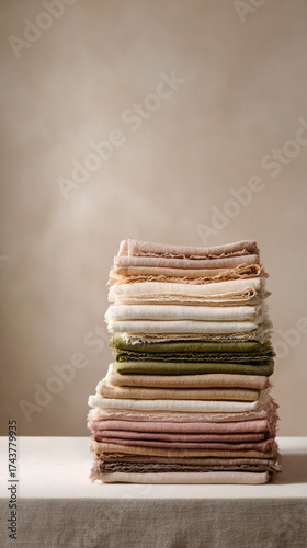 A neatly folded stack of organic cotton fabrics in soft, neutral tones.
