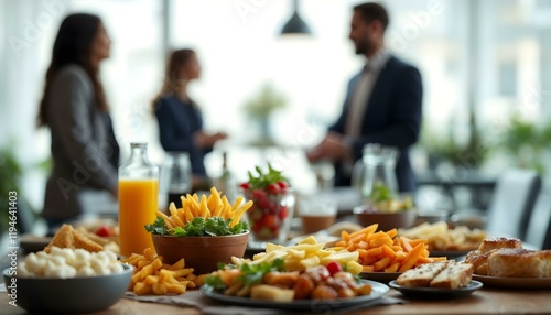 A neatly organized buffet table at an office gathering, featuring a variety of food and drinks for guests