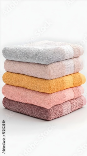 A Neatly Stacked Arrangement of Soft and Plush Pastel Colored Towels Displayed on a Pristine White Background