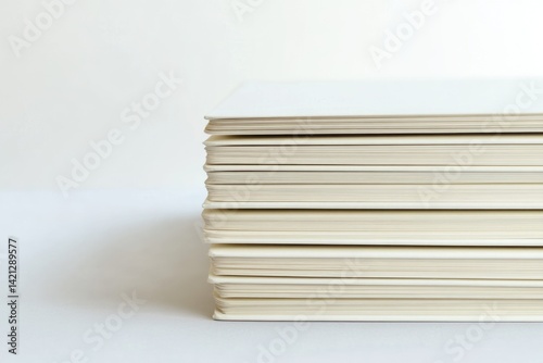 A neatly stacked pile of blank, off-white books against a white background.