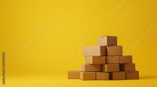A neatly stacked pile of cardboard boxes on a plain yellow background, symbolizing moving or storage organization. Copy space