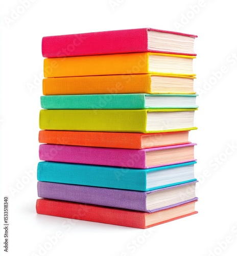 A neatly stacked pile of ten vibrant, colorful hardcover books, isolated on a white background