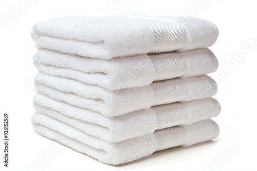A neatly stacked set of white towels, isolated on a white background, showcasing their soft, plush texture and clean appearance, ideal for bathroom or spa use, selected focus
