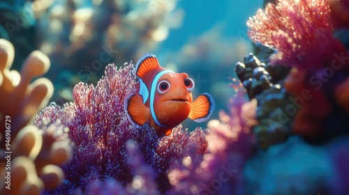 A Nemo fish peeking out from behind a coral branch, with a backdrop of colorful coral gardens and marine life, capturing the serenity of underwater exploration