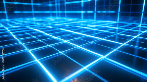 A neon blue grid glowing with intense light, forming a futuristic and immersive digital floor.