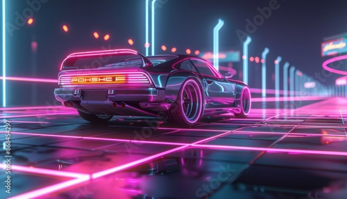 A neon car is driving down a neon road