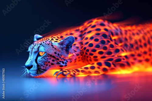 A neon cheetah with glowing blue eyes is stalking its prey in the dark.