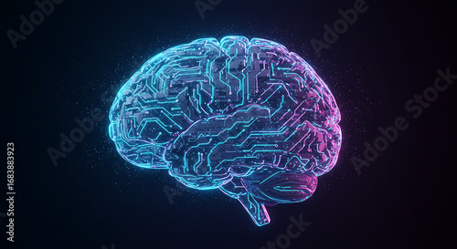 A neon lit anatomical human brain displaying complex network connections against a dark backdrop.