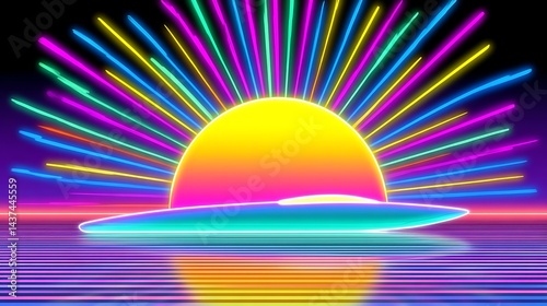 A neon sunset with a stylized boat and reflections in the water