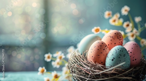 A nest filled with eggs and flowers on a table. Suitable for spring and Easter themes