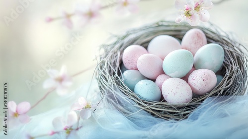 A nest-shaped basket packed with hand-painted eggs on a soft pastel gradient backdrop.