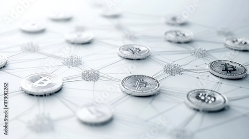 A network graph of interconnected coins, blockchain and finance theme, sleek futuristic style, isolated on white background