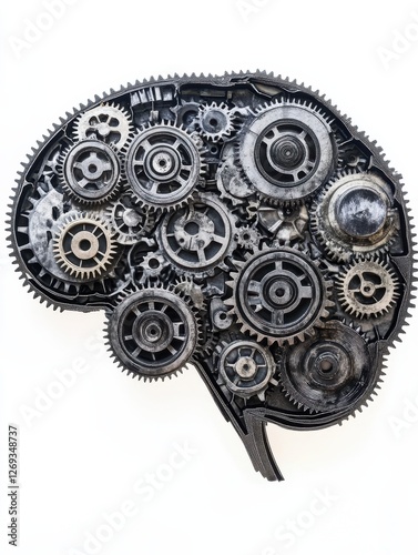 A network of gears and cogs shaped like a human brain, each gear representing different employee roles and skills, turning in harmony to signify well-planned workforce operations