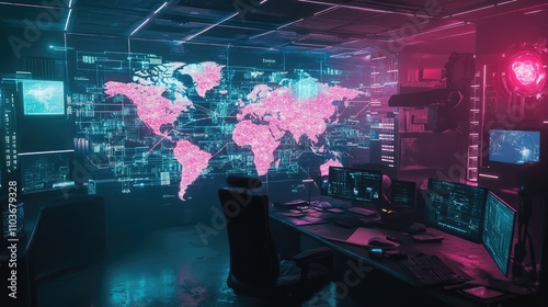 A network of holographic world maps with glowing connections, suspended in a dark tech lab; cyberpunk style, neon blue and magenta tones, ultra-detailed