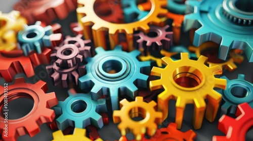 A network of interconnected gears in different colors and sizes, Symbolizing the integration and collaboration of diverse talents, photography style