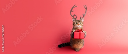 A neutered cat with a red gift box and deer antlers on its head, with the text "Merry Christmas" in a cursive font on the left side of the banner, red background with Christmas Theme. - Generative AI