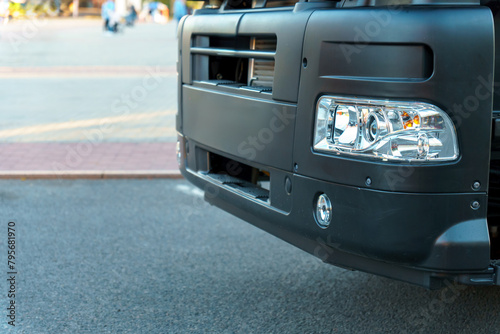 A new truck with a trailer on the road. Details of the truck in close-up. New headlights and wheels of the car. The concept of cargo transportation