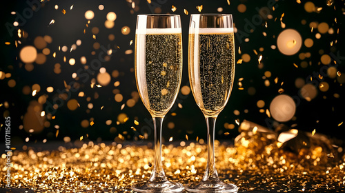 A New Year's Eve background with golden confetti and champagne glasses ready to toast at midnight