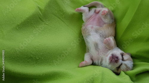 a newborn Chihuahua puppy sleeps on a green blanket. a fawn-colored dog. cute little dog.