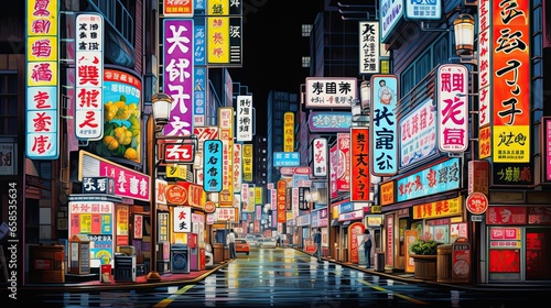 A Nighttime Symphony as Neon Signs Illuminate the Bustling Streets