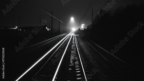 A nighttime view of railway tracks leading into a foggy distance, illuminated by distant lights.