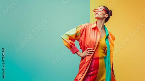 A northern woman dressed in a contemporary outfit featuring vibrant colors and flowing fabrics. The combination of a cozy knitted sweater with a dramatic, colorful skirt creates a striking