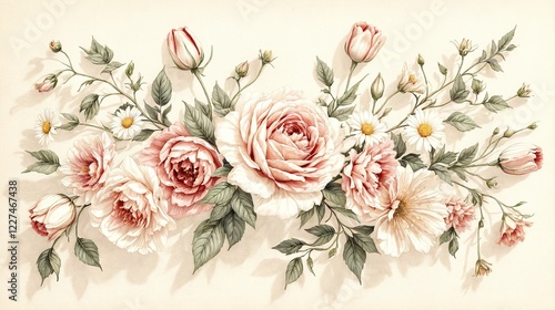 A nostalgic and detailed botanical illustration featuring various classic flowers—roses, tulips, and daisies—arranged harmoniously in an old-fashioned, vintage aesthetic.