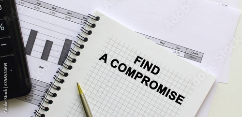 A notebook lies among the financial statements on the office desk. In the notebook, the inscription