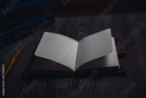 A notebook with a gold pen on the table in the candlelight