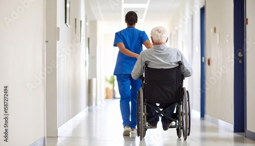 A nurse in blue scrubs pushes an elderly man in a wheelchair down a brightly lit hospital corridor.
