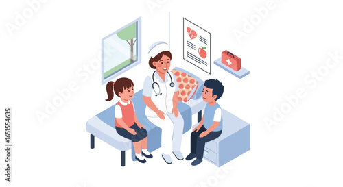 A nurse sits on a hospital bed with a young girl and boy, providing care and attention in a bright, friendly setting.