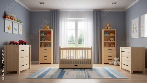 A nursery room with a crib, dresser, and a rocking chair. The room is decorated with a blue and white color scheme and has a lot of stuffed animals