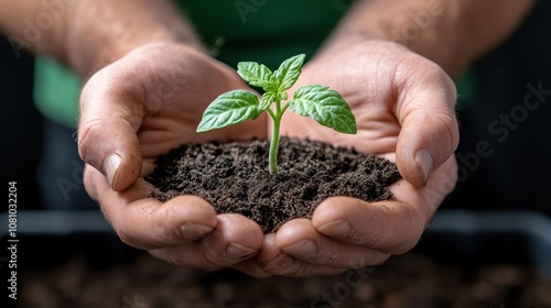 A nurturing pair of hands holds a small, vibrant green plant growing in rich, dark soil, representing growth, care, and environmental sustainability, filled with hope.