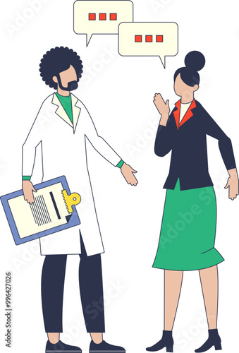 A nutritionist in a lab coat consults with a client, holding a clipboard. Speech bubbles indicate a discussion.