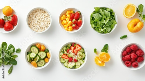 A nutritious top view of a meal with muesli, mixed vegetable salad, and fresh fruits, highlighting a balanced diet against a simple white background.